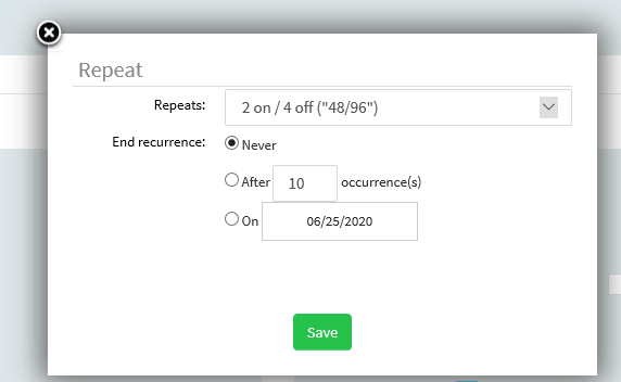 Note: There are various different recurrence rules built into the system. These are in place to accommodate most shift scheduling needs. If you are in need of a new recurrence rule for your organization that is not listed, please contact us.