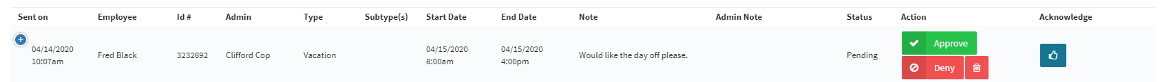 Employees who have the permission to do so will have the ability to Approve / Deny time off requests submitted by employees.