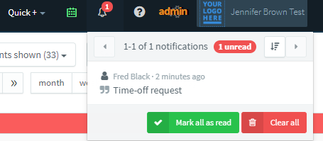 When a new time off request is submitted by an employee, you will receive a notification by an app alert and email notification. Once you log in to your CrewSense account, you will notice a growl notification beneath the bell atop your screen. This alerts you to the pending request. Clicking the bell will show you all alerts needing your attention.