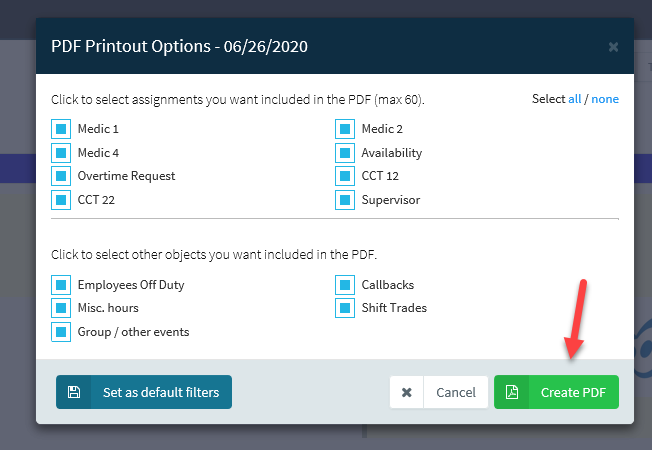 This will open a pop up and you will then filter what assignments and objects from the CrewScheduler you want included in your printable PDF. Once you have selected what you want included and if you intend to print the same filters often, you can elect to set your selected filters as a saved default.