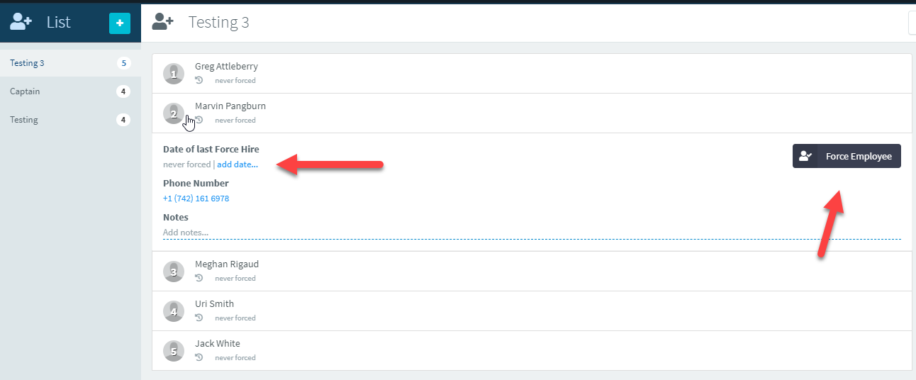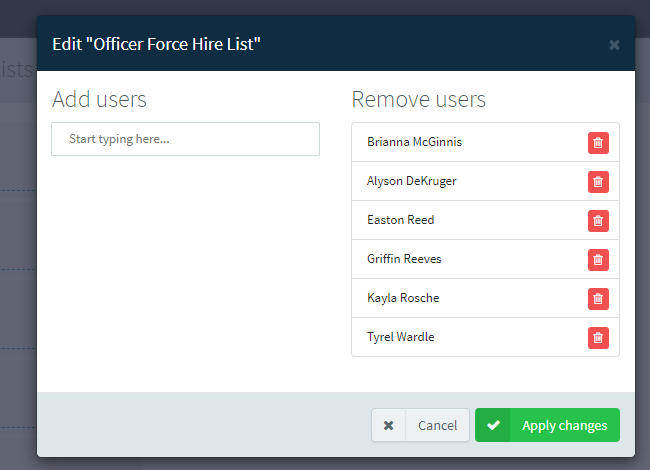 First, name your new Force hire list. Then, you can tell the system how to order the employees in the Force Hire list by selecting either manual, by last force hire date or by callback ranking. Lastly, choose which employees you want to include in your Force Hire list. The scheduling system uses an advanced input detection feature that allows you to search keywords. You can add individual employees, entire groups, entire lists, and more. In this example, we will add everyone who is a part of the 'Officer' CallBack list, as well as one user, 'Tyrel Wardle':