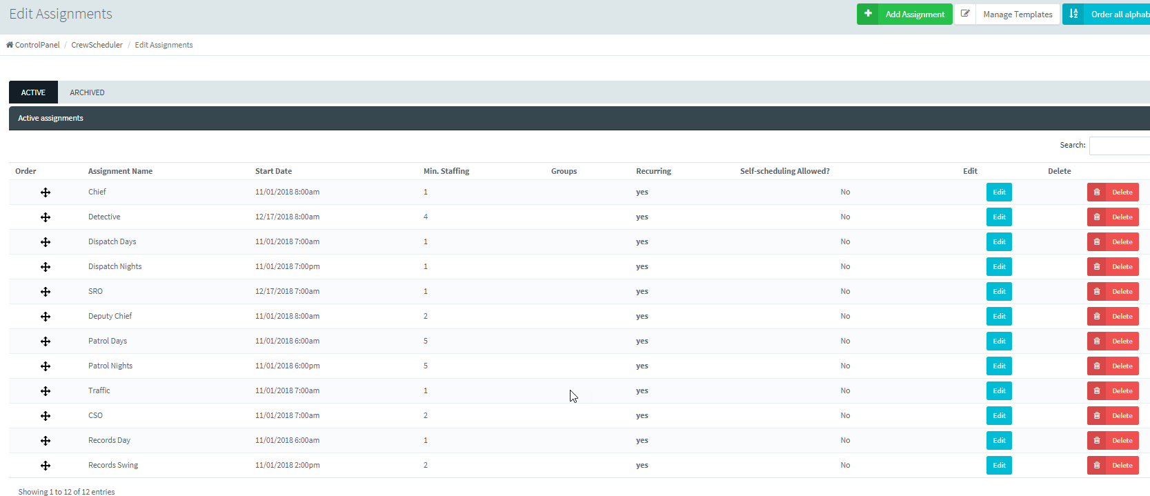 Think of your assignments as the places you need to fill in your employees. Most Law Enforcement Agencies do this by shift or team. You will also want to create separate assignments for your command staff and support employees who work different shifts and sometimes locations. Remember you will want your assignments to recur daily (or all weekdays for Monday- Friday employees); you will place the work rotation on the employee themselves when you assign them on the CrewScheduler. Set up your minimum staffing levels for the assignments, which will auto-populate the slots that need to be filled for the day. You can always add more slots as you need them. And you can have as many assignments as you need-- not all assignments require the positions to be filled. Remember, you can choose whether or not you wish to show vacant spots.