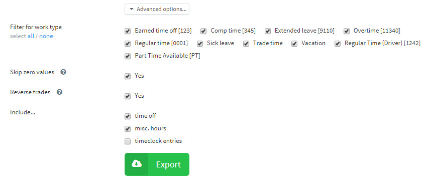 Clicking the Advanced Options offers you a more detailed list of options for the reports, such as just the comp time work type or any entries made to the time clock.