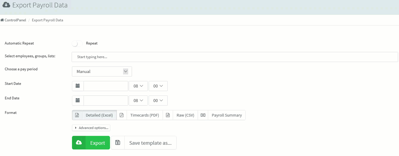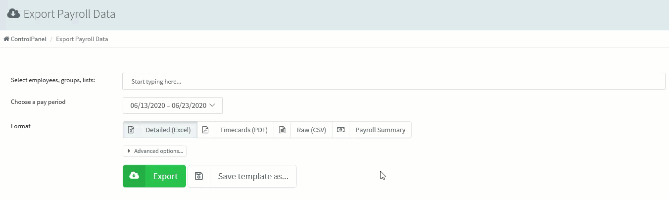 Then click either the Detailed (Excel), Timecards (PDF), Raw (CSV) or the Payroll Summary option. Exporting as PDF will provide you a clean, printable sheet of data with signature fields. Exporting as Excel will provide a spreadsheet file, and exporting as a CSV file will export a database of the data, which you can then import into a spreadsheet system (Excel, Open Office, etc) or manipulate how you see fit. The Payroll Summary gives a summary of all data and is most useful.