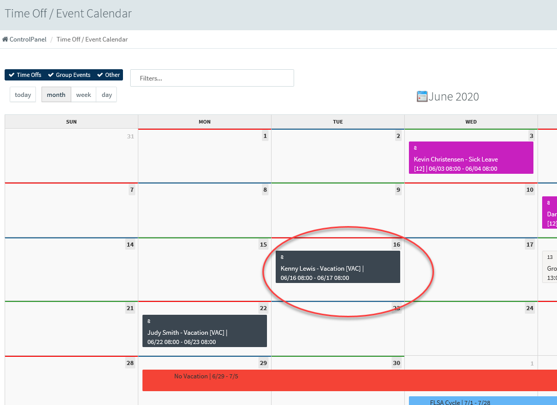 Simply add your information and click + Save. Now, we'll notice on June 16, Kenny has been placed on Vacation time off.